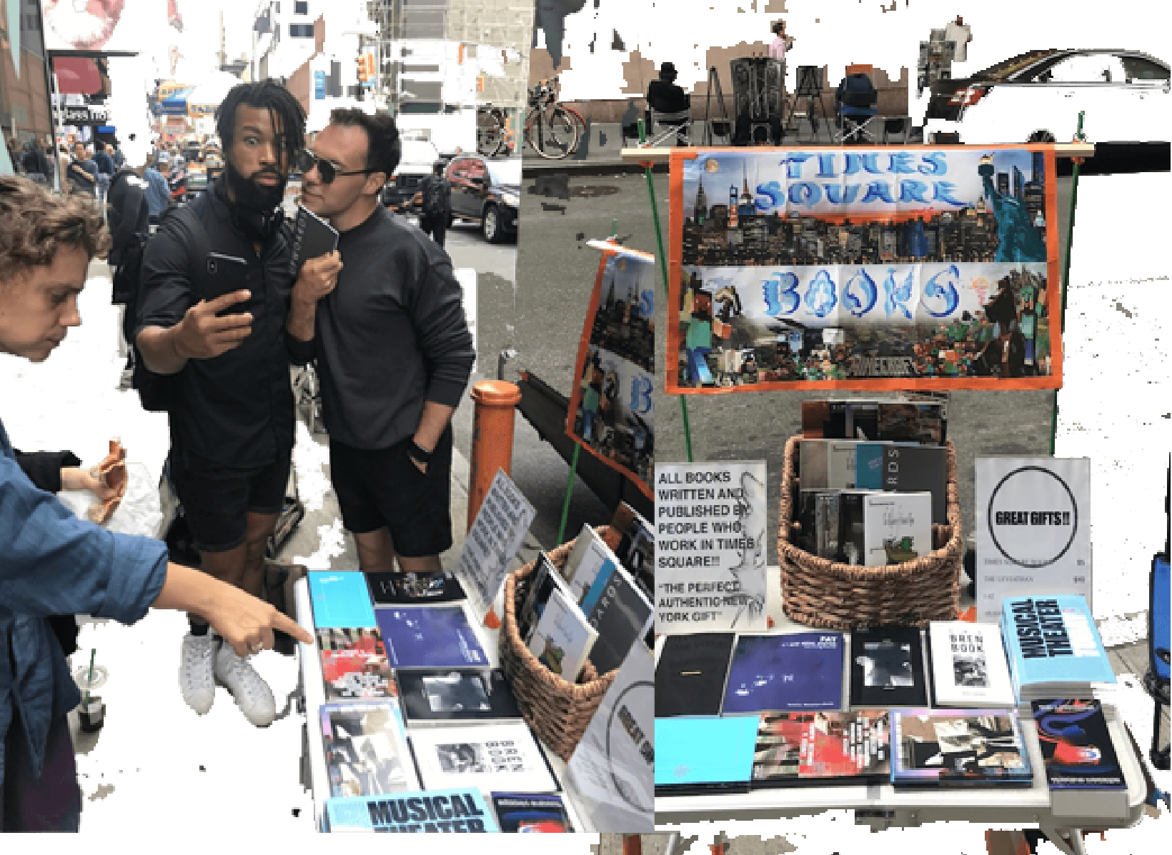 1. We establish a home base with a table and there we sell books. We sell Times Square Books, but also others.